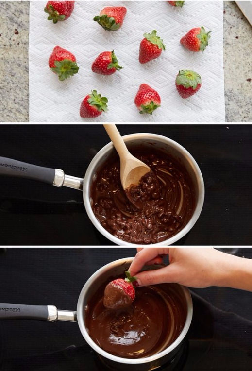 3 Dip lower half of each strawberry into chocolate mixture; allow excess to drip back into saucepan. Place on waxed paper-lined tray or cookie sheet.