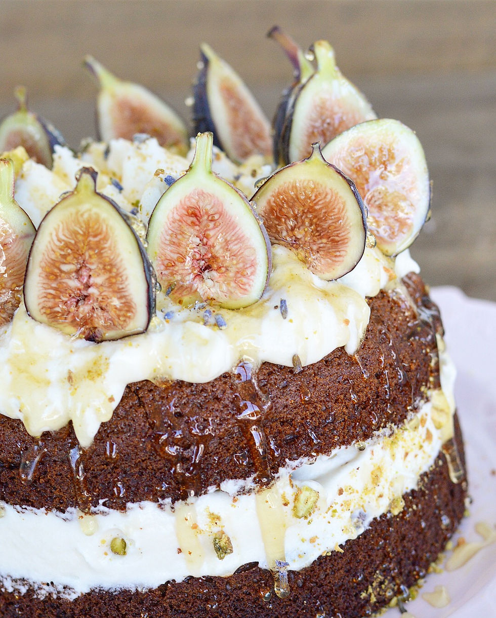 Moist Honey Cake with Fig, Honey Cream Cheese & Pistachio Filling